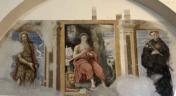 Ed ora attraverso una porta, a destra, passiamo in sacrestia. Dipinti sul muro vediamo San Girolamo tra san Giovanni Battista e San Nicola da Tolentino (?)
